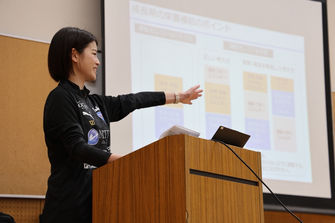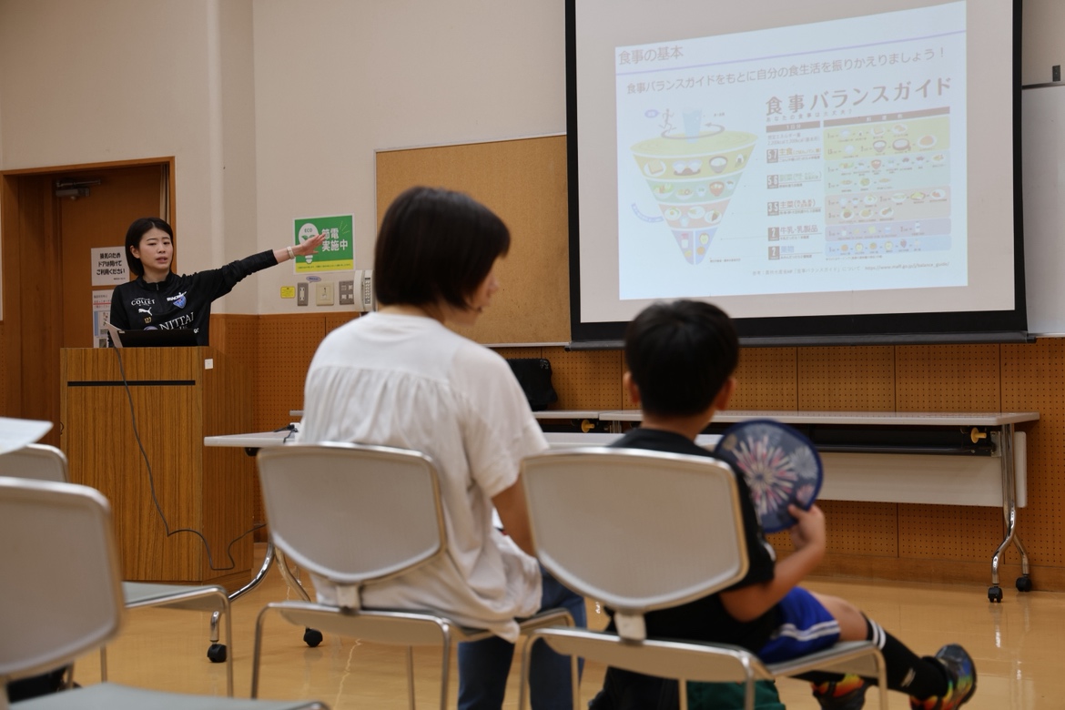 セミナーの最後には横浜FCトップチームの選手たちに実際に提供している食事を紹介しながら栄養講座の内容の振り返りを行いました。前日に行われた試合後の食事について紹介した際にはその内容や工夫しているポイントについて熱心に聞いていただくことができました。